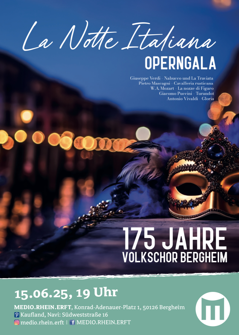 Stimmgewaltig wird der Volkschor Bergheim neben bekannten Melodien den berühmten Gefangenenchor aus Nabucco anstimmen und Sie ins Land des "Bel canto" mitnehmen. Freuen Sie sich auf einen unterhaltsamen Abend und feiern Sie mit uns gemeinsam das 175-jährige Bestehen und die damit verbundenen zahlreichen musikalischen Erfolge in Bergheim.