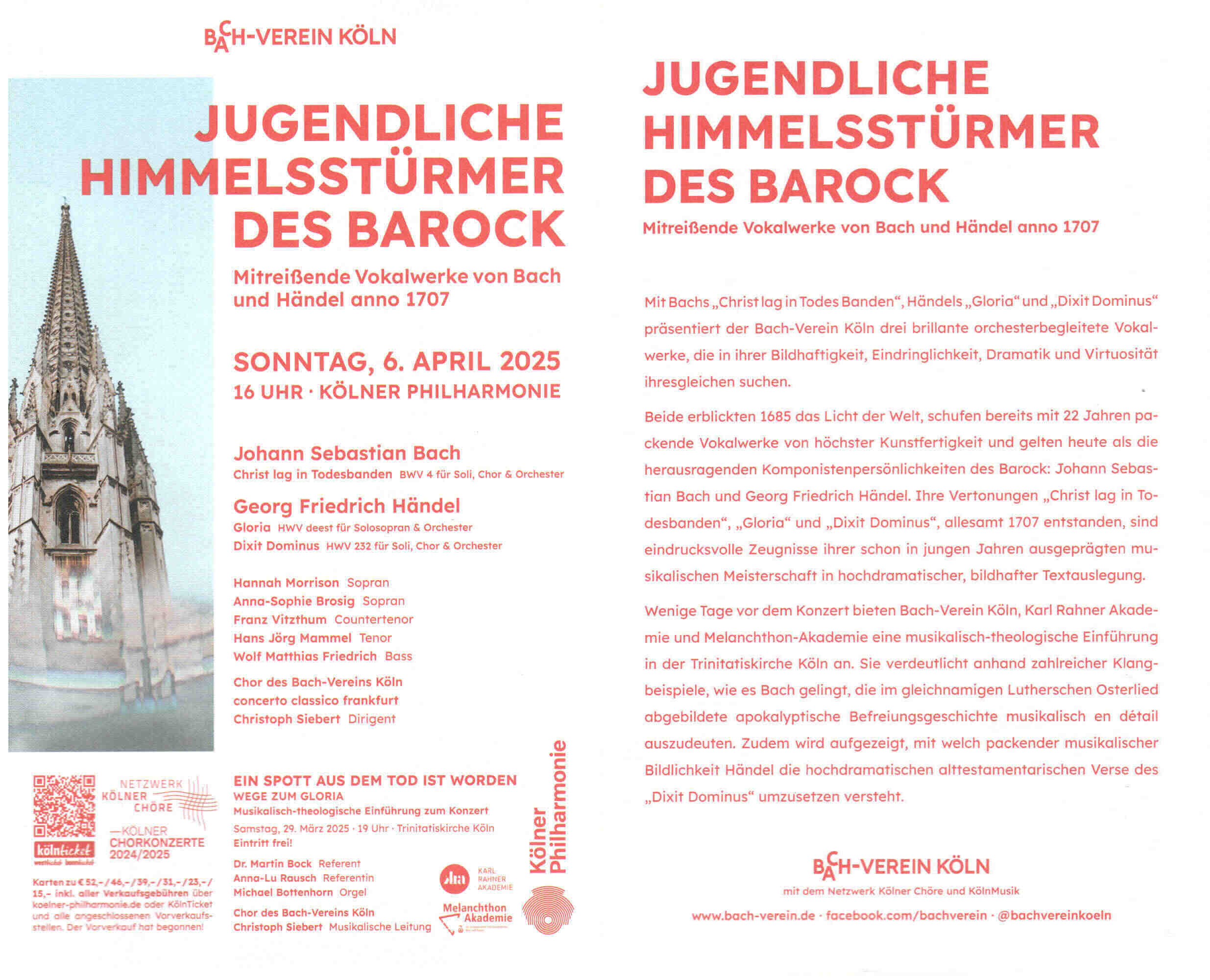 Beide erblickten 1685 das Licht der Welt, schufen bereits mit 22 Jahren packende Vokalwerke von höchster Kunstfertigkeit und gelten heute als die herausragenden Komponistenpersönlichkeiten des Barock: Johann Sebastian Bach und Georg Friedrich Händel. Ihre Vertonungen „Christ lag in Todesbanden“, „Gloria“ und „Dixit Dominus“, allesamt 1707 entstanden, sind eindrucksvolle Zeugnisse ihrer schon in jungen Jahren ausgeprägten musikalischen Meisterschaft in hochdramatischer, bildhafter Textauslegung.