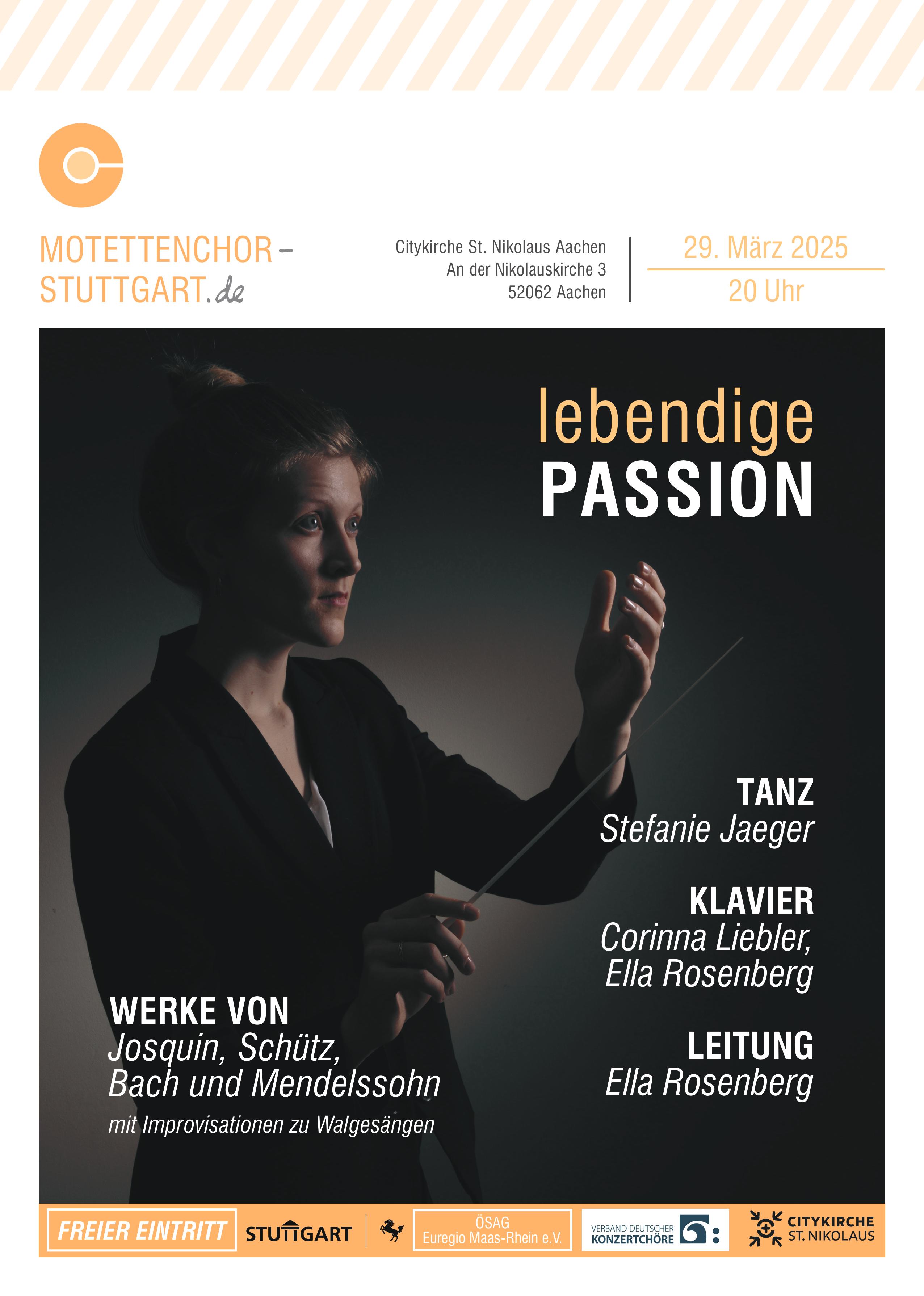 Zwischen Hoffnung und Leid, Nähe und Ferne und mit dem Versuch das Leid und die Leidenschaft miteinander in Einklang zu bringen, lädt der Motettenchor Stuttgart am 29. März um 20 Uhr zu einem spannenden Konzert unter dem Motto „lebendige PASSION“ ein. Mit Tänzerin Stefanie Jäger und Werken von Josquin, Schütz, Bach und Mendelssohn sowie Improvisationen zu Walgesängen nehmen die Sängerinnen und Sänger unter Leitung von Dirigentin Ella Rosenberg, Sie mit auf eine tiefe und eindrückliche Reise mit Bewegung, Dialog in der Musik durch doppelchörige Motetten und dem Klang der Natur.