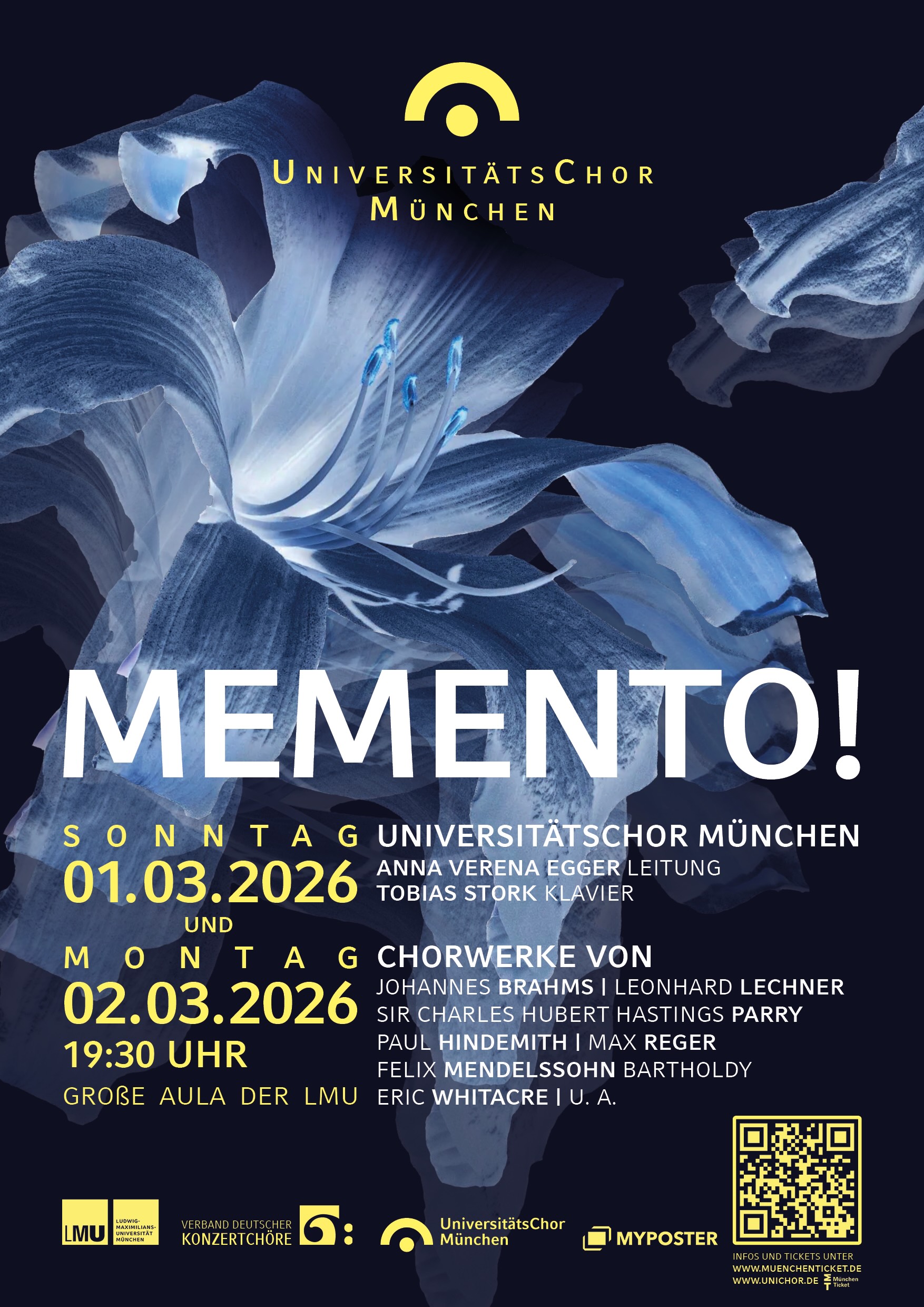 Dieses Wintersemester widmet sich der UniversitätsChor München unter dem Titel Memento! einem A-cappella-Programm, das sich mit der Vergänglichkeit als einer grundlegenden Dimension menschlicher Existenz auseinandersetzt. Das Konzert vereint Werke verschiedener Epochen und Stilrichtungen, die sich auf unterschiedliche Weise mit Leben, Tod, Erinnerung und Trost befassen.