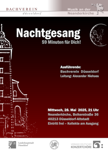 Der Bachverein Düsseldorf und die Neanderkirche laden Sie wieder zum „Nachtgesang“ in die Düsseldorfer Altstadt ein. Der Zeitpunkt (Mittwochabend, 21 Uhr) ist ebenso ungewöhnlich wie das gestalterische Format. Freuen Sie sich auf eine 59-minütige Auszeit mit A-cappella-Gesang und erläuternder Moderation. Kommen, zuhören, genießen!