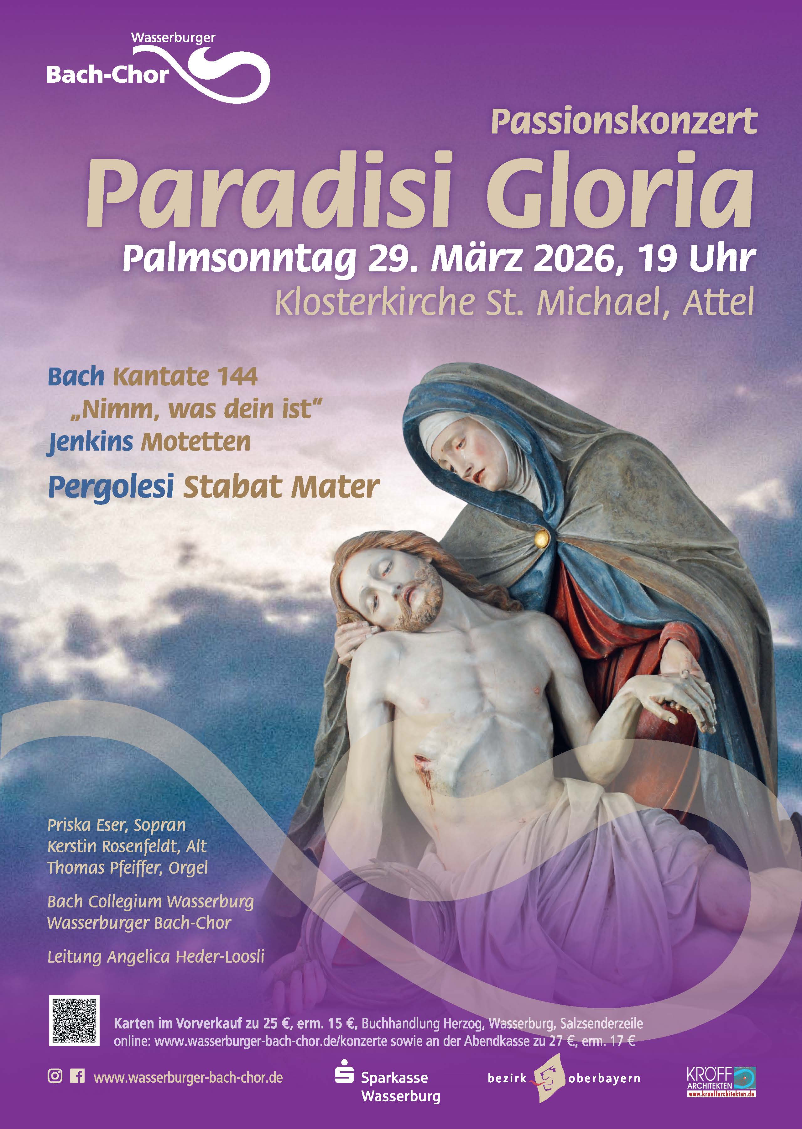 Karten gibt es im Vorverkauf zu 25 €, erm. 15 €, bei der Buchhandlung Herzog in Wasserburg, online unter www.wasserburger-bach-chor/konzerte sowie an der Abendkasse zu 27 €, erm. 17 €.