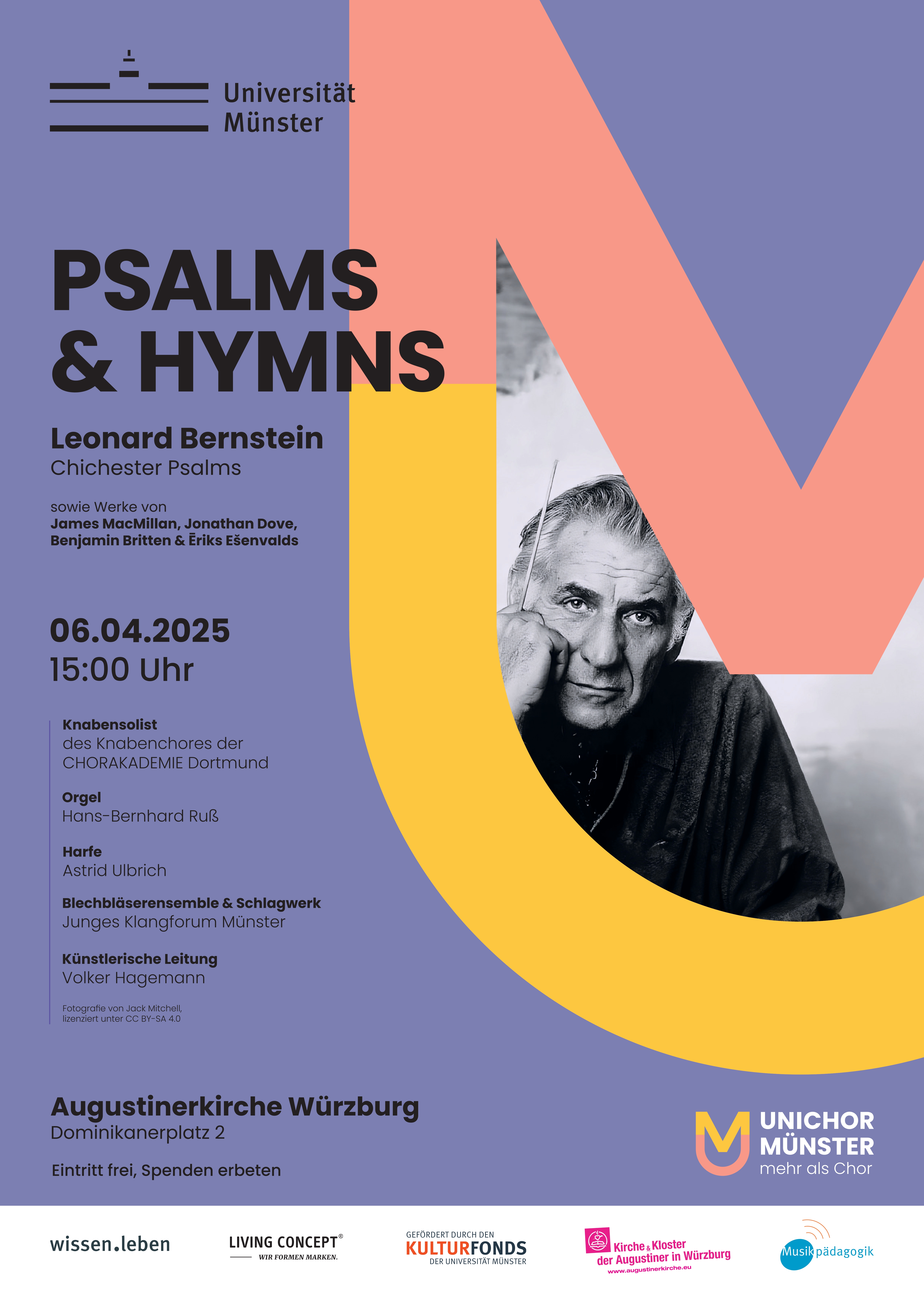 Klanggewalt pur mit dem Unichor Münster! Leonard Bernsteins „Chichester Psalms“ in der Fassung für Orgel, Schlagwerk und Harfe eröffnen einen Dualismus zwischen Harmonie und Spannung, Lyrik und Rhythmus, Zartheit und Kraft. James MacMillans kolossales „Tu es Petrus“, Jonathan Doves transzendentes „Seek Him that Maketh the Seven Stars“, Benjamin Brittens eigenwilliger Lobpreis „Rejoice in the Lamb“ und Ēriks Ešenvalds majestätisches „Trinity Te Deum“ ergänzen Bernsteins mitreißende Psalmenvertonung. Im Rahmen der ersten Konzertreise seit vielen Jahren gastiert der Unichor Münster - begleitet von renommierten Instrumentalistinnen und Instrumentalisten - in der Augustinerkirche Würzburg.
