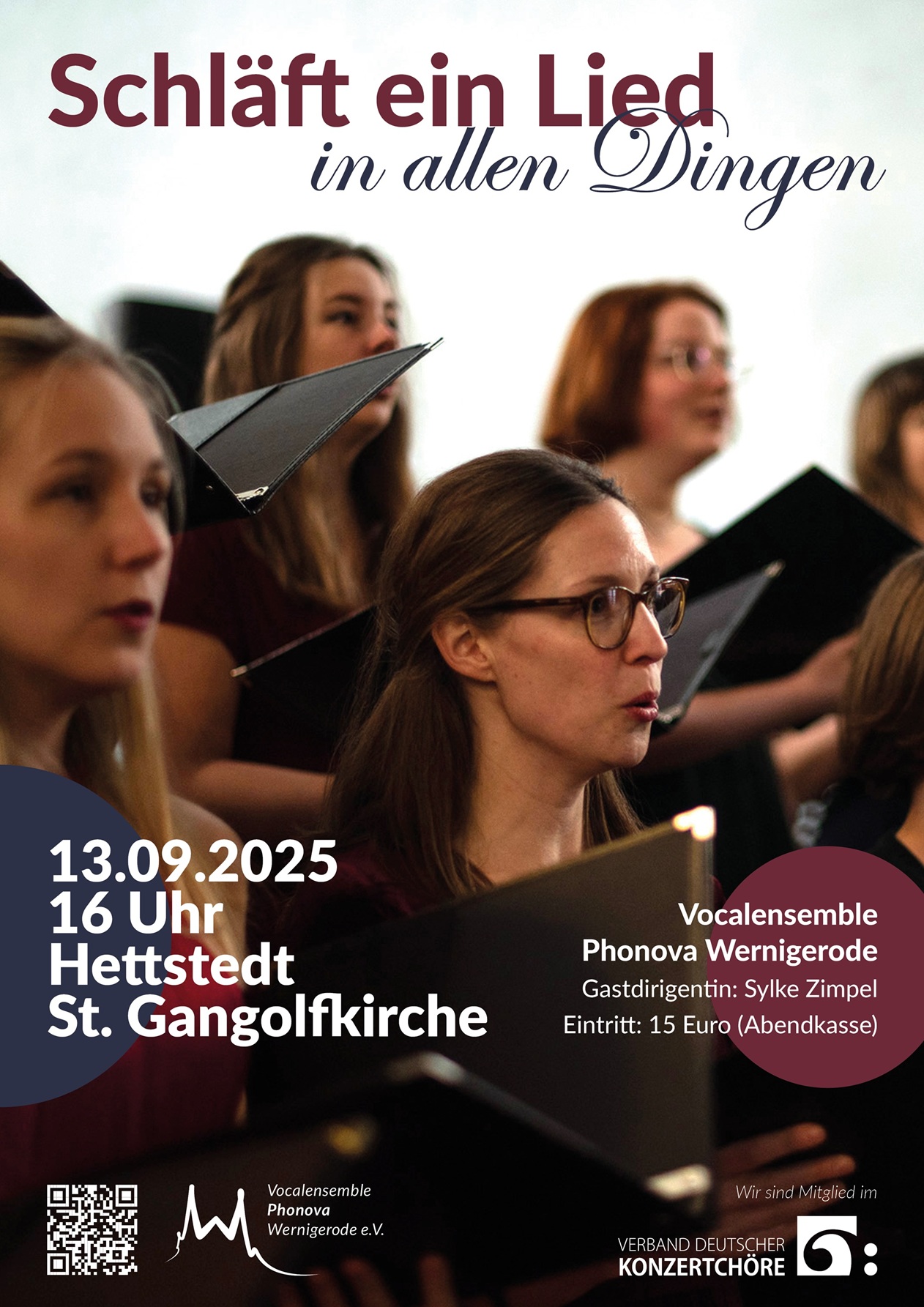 Nach seiner erfolgreichen Wettbewerbsteilnahme an den European Choir Games & Grand Prix of Nations im Juli 2025 in Dänemark kommt das Vocalensemble Phonova Wernigerode mit neuen musikalischen Eindrücken und einem bunt gemischten Programm nach Hettstedt. Am Samstag, 13. September, gastiert der Frauenchor ab 16 Uhr in der Gangolfkirche. Unter dem Titel „Schläft ein Lied in allen Dingen“ präsentieren die Sängerinnen Auszüge aus ihren zwei Wettbewerbsprogrammen sowie einige neu einstudierte Titel. Neben verträumten Romanzen von Johannes Brahms und geistlichen Titeln von Nancy Telfer erklingen vorwiegend deutsche sowie internationale Volksweisen aus Frankreich, Belarus, Slowenien, Schweden und Dänemark. Die künstlerische Leitung übernimmt Gastdirigentin Sylke Zimpel.