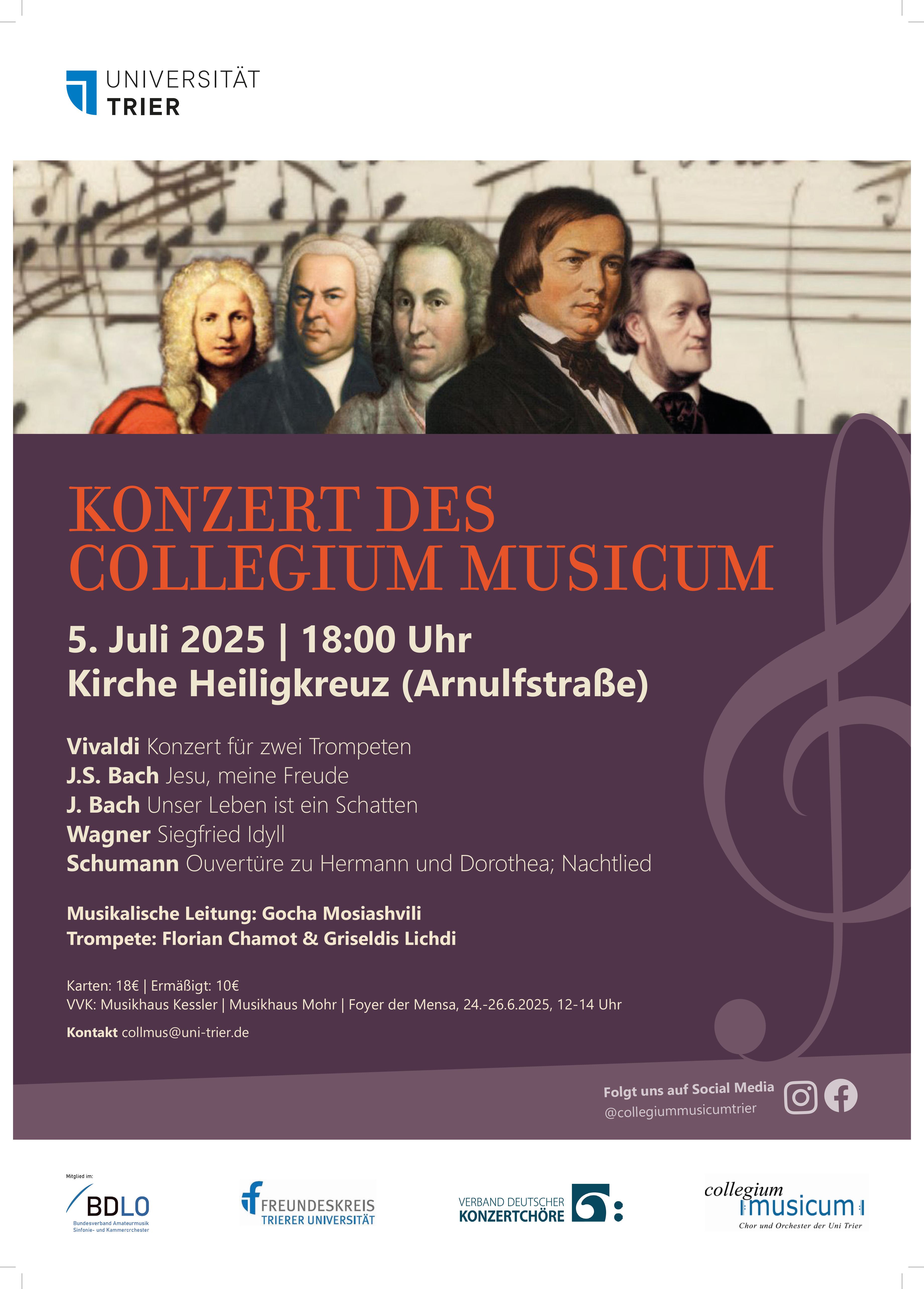 Am 5. Juli 2025 um 18 Uhr veranstaltet das Collegium Musicum der Universität Trier wieder sein Semesterabschlusskonzert. Mit Schwerpunkt auf Barock und Romantik besteht das Programm aus einem breiten Spektrum an Werken.