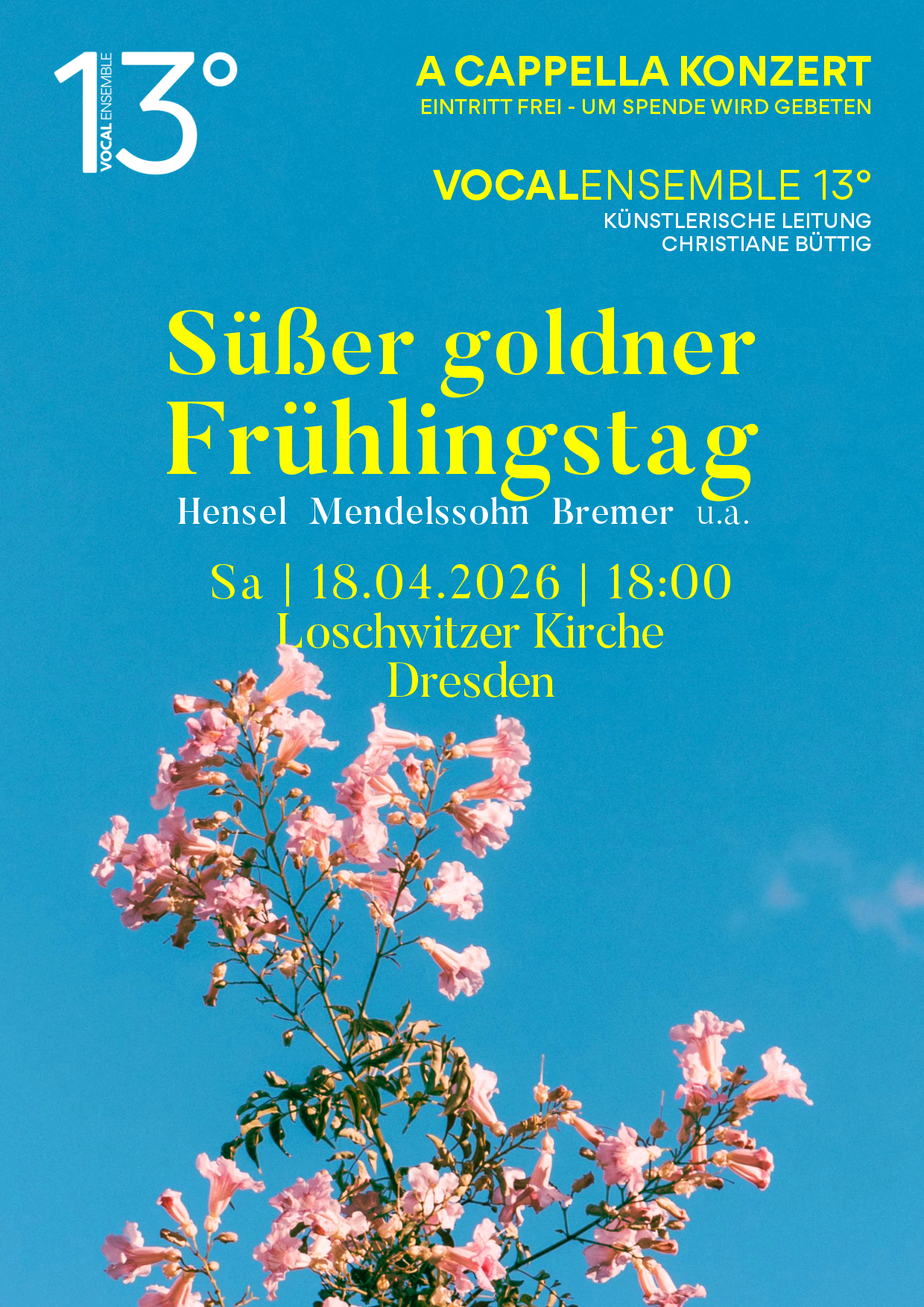 Es singt das Vocalensemble 13° unter der Leitung von Christiane Büttig - hervorgegangen aus dem Dresdner Universitätschor und verbunden durch musikalische Freundschaft zwischen Dresden und Salzburg. Entlang des 13. Längengrades vereinen sich Stimmen in klanglicher Neugier und Freude am a-capella-Gesang.