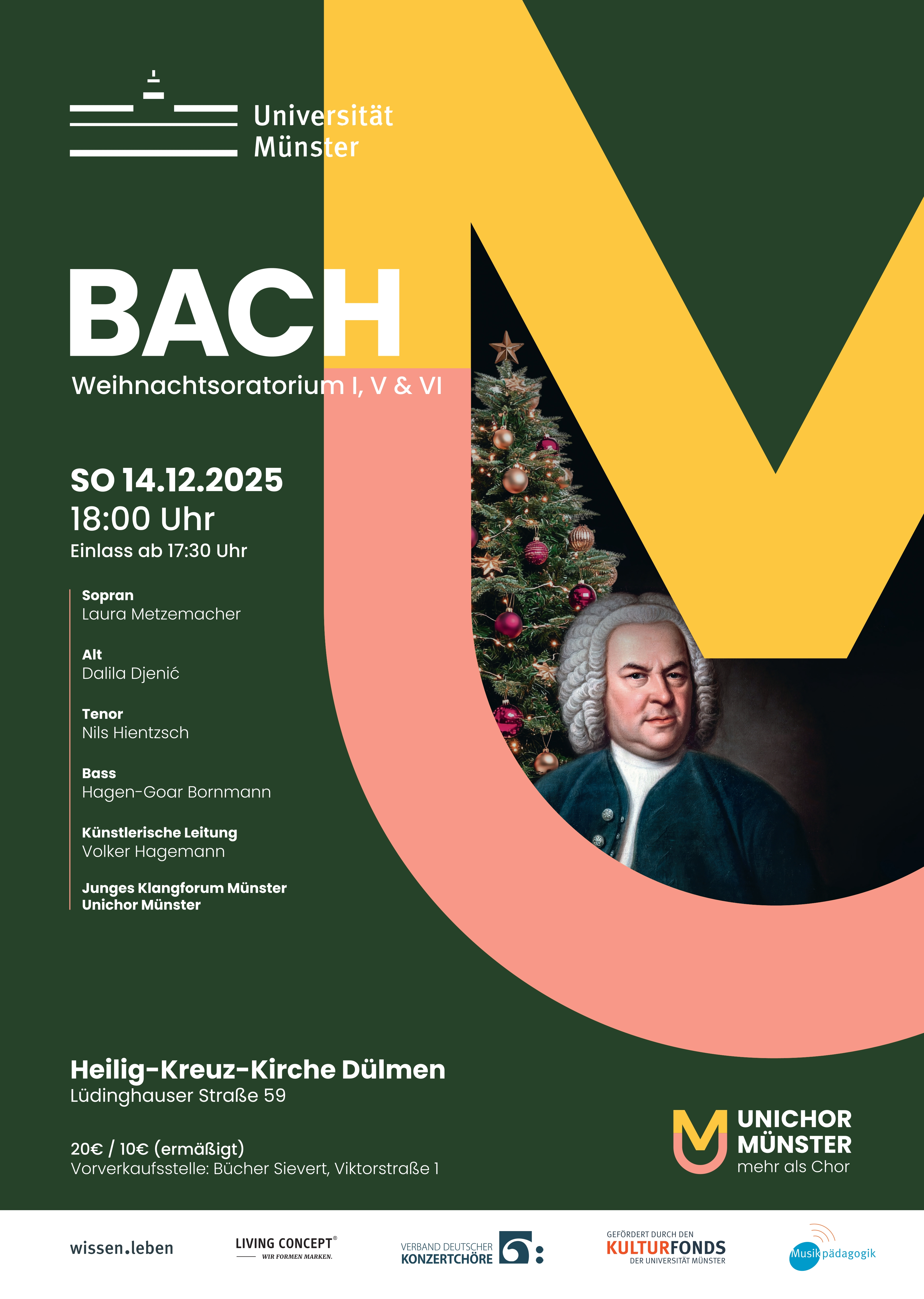 Der Evergreen begeistert mit festlichen Chören, lebhaften Arien und einer Prise barocker Eleganz. In den Kantaten I, V und VI wird von der Geburt Christi, dem Stern von Bethlehem und der Ankunft der Weisen erzählt. Erleben Sie den Unichor Münster mit diesem musikalischen Feuerwerk in der Heilig-Kreuz-Kirche Dülmen – mitreißend, dynamisch und voller Energie.
