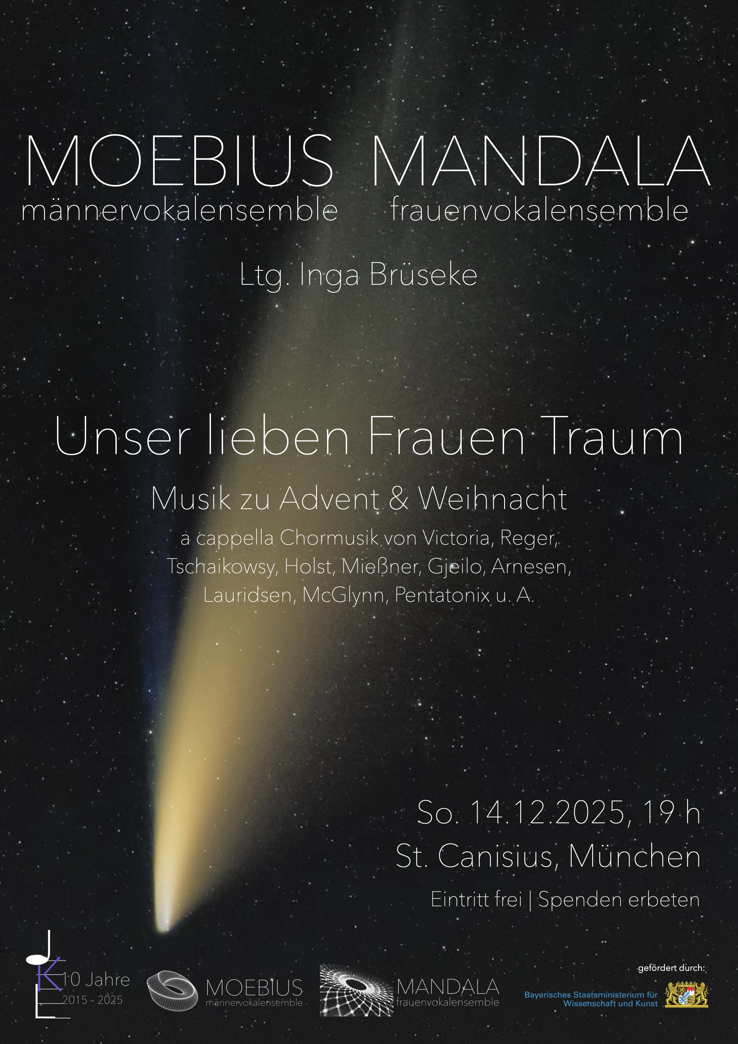 Am So. den 14. Dezember um 19 Uhr laden das Frauenvokaensemble MANDALA und das Männervokalensemble MOEBIUS des Jungen Kammerchor Lucente nach St. Canisius (München-Hadern) ein: