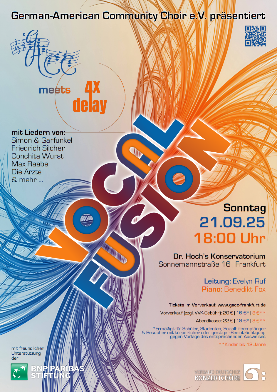 German American Community Choir meets 4xdelay – Chor trifft auf A-Capella-Männerquartett für ein ganz besonderes Hör-Erlebnis. Genießen Sie diese ungewöhnliche Vocal Fusion und lassen sich überraschen von einer musikalischen Reise mit Liedern von Friedrich Silcher, Conchita Wurst, Max Raabe oder den Ärzten.
