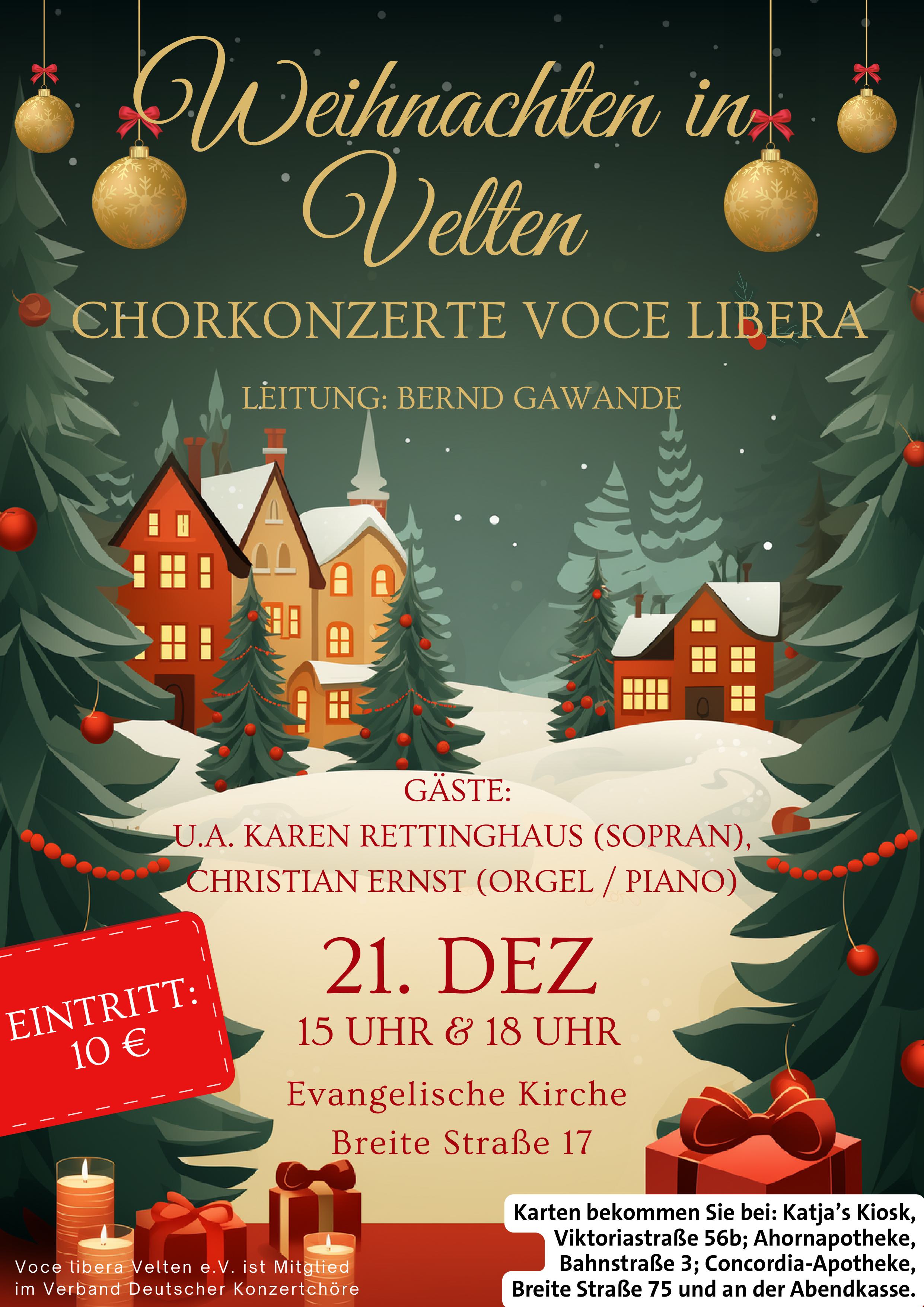 Am 4. Advent lädt Voce libera zu zwei Weihnachtskonzerte in der evangelischen Kirche Velten ein. Das erste Konzert beginnt um 15, das zweite Konzert um 18 Uhr. Konzertdauer etwa 90 Minuten. Bereichert werden die Konzerte von externen Künstlern, u.a. mit Karen Rettinghaus (Sopran) und Christian Ernst (Orgel / Piano). Der Eintritt beträgt 10 EUR.