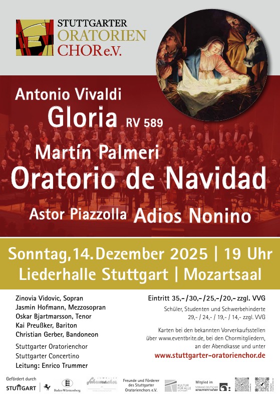 Nach der Pause präsentieren wir einem aufgeschlossenen Publikum das "Oratorio de Navidad". Martin Palmeri, auch Argentinier, verarbeitet in seinem - leider selten aufgeführten - Werk zahlreiche stilistische Einflüsse der jüngeren Musikgeschichte und - unüberhörbar - des Tango Nuevo. Zweifellos handelt es sich um ein unverwechselbares, sehr originelles sakrales Werk, das den Geist von Weihnachten authentisch mit einer individuellen Tonsprache vermittelt. Das "argentinische Weihnachtoratorium" dürfte mit seiner Fülle an eingängigen und ausdrucksvollen Themen leicht einen Weg in die Herzen des Publikums finden.