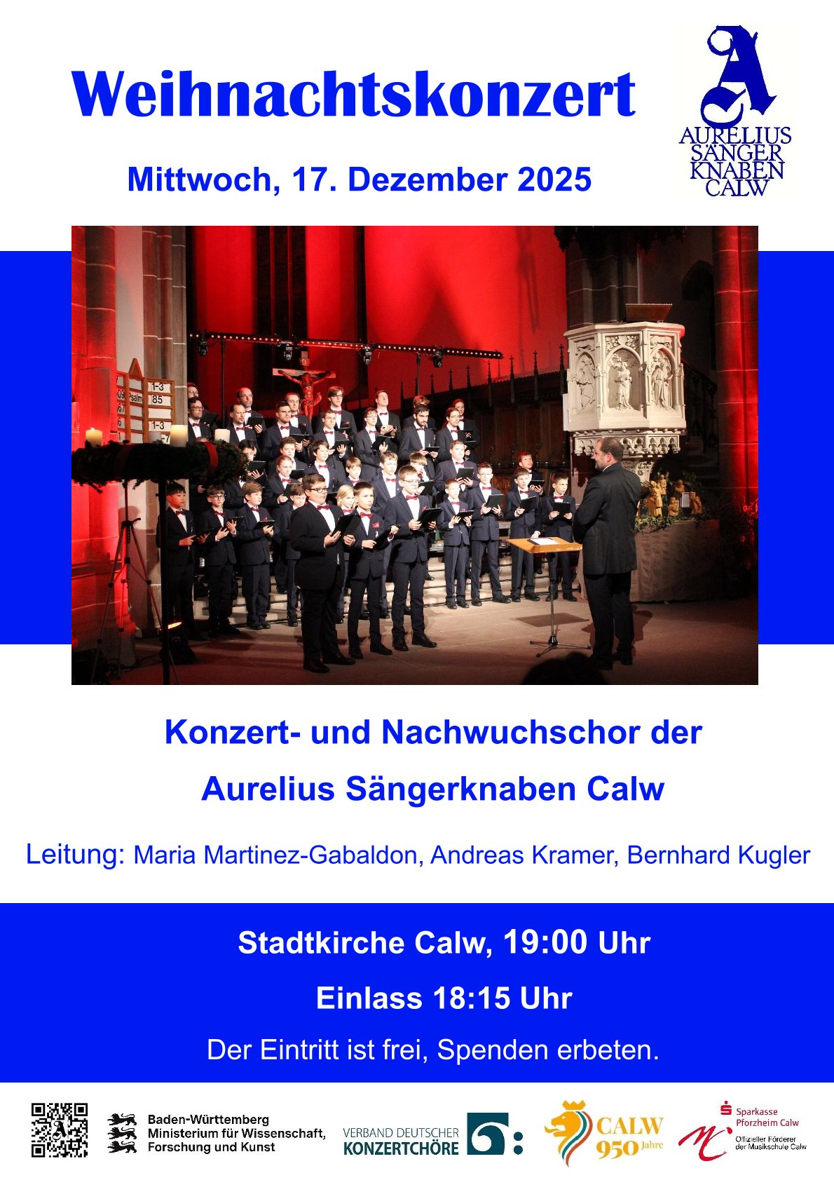 Die Aurelius Sängerknaben Calw laden am Mittwoch, den 17. Dezember um 19:00 Uhr zum Weihnachtskonzert in die evangelische Stadtkirche Calw ein. Unter der Leitung von Maria Martinez-Gabaldon, Andreas Kramer und Bernhard Kugler gestalten der Mädchen- und Knabenchor der Nachwuchschorstufe sowie der Konzertchor der Aurelius Sängerknaben Calw in verschiedenen Besetzungen ein abwechslungsreiches, besinnliches Programm zur Advents- und Weihnachtszeit. Der Einlass ist um 18.15 Uhr. Der Eintritt ist frei, um Spenden wird gebeten.
