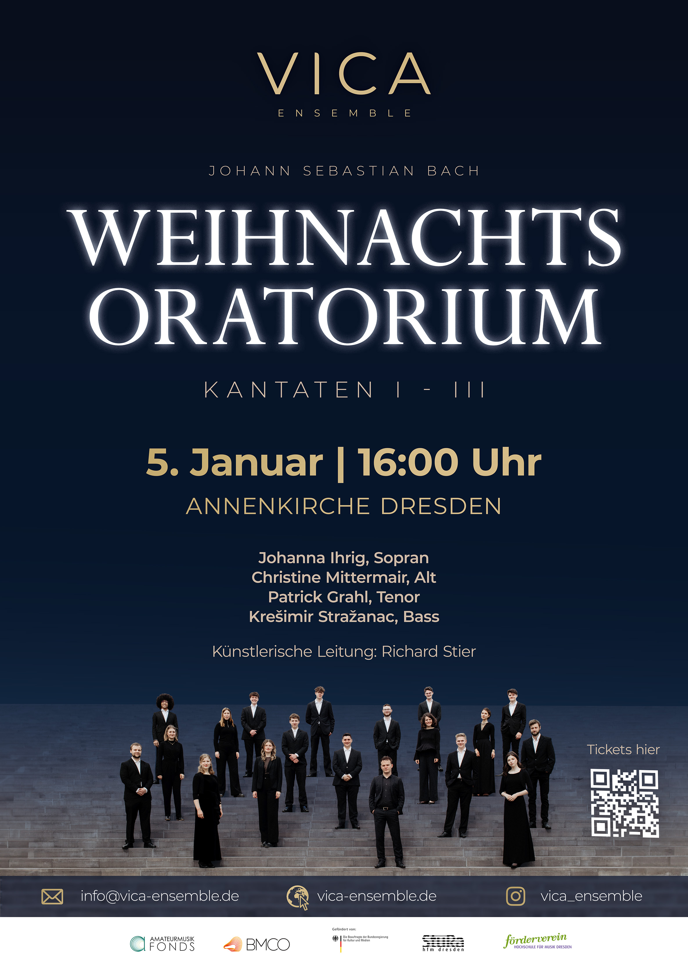 In der Annenkirche Dresden musiziert der VICA Kammerchor gemeinsam mit dem VICA Kammerorchester die Kantaten I bis III mit den fantastischen Solist:innen Johanna Ihrig, Christine Mittermair, Patrick Grahl und Krešimir Stražanac! Die künstlerische Leitung hat Richard Stier.