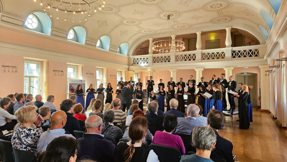 Im Eröffnungskonzert unter dem Motto „V“ = „Vielfalt“ und „Verbindung“ im Coudray-Saal der Musikschule „Johann Nepomuk Hummel“ (16 Uhr) umrahmten niveauvolle Chorbeiträge die traditionelle Verleihung des Georg-Friedrich-Händel-Ringes des VDKC an Prof. Hans-Christoph Rademann. Einen Erinnerungsring für den Georg-Friedrich-Händel-Ring-Träger Prof. Marcus Creed nahm stellvertretend seine ehemalige Schülerin Prof. Judith Mohr entgegen. KMD Prof. Jürgen Budday zum Konzert: „Die Verleihung des Händel-Ringes war im Eröffnungskonzert gleich eingebettet in ein musikalisches Gipfeltreffen: faszinierend die Homogenität der Camerata Vocale aus Zwickau, verblüffend die Klangpracht des Maulbronner Kammerchores.“ Der intime Charakter des architektonischen Kleinods Coudray-Saal unterstrich die kammermusikalischen, ausgefeilten Darbietungen der Chöre und verlieh dem Eröffnungskonzert eine besondere Atmosphäre.