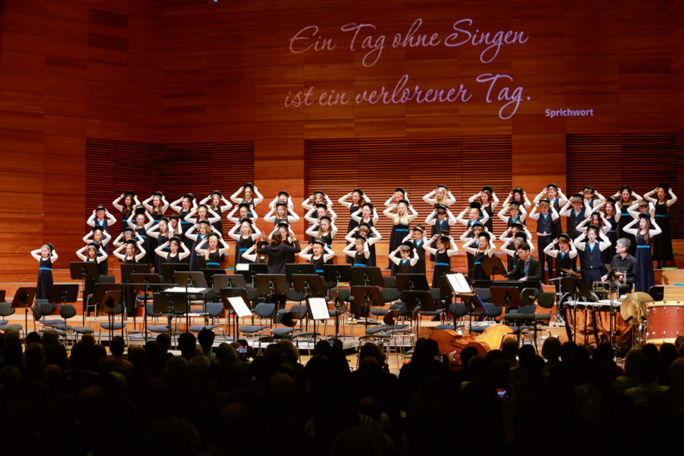Im Festkonzert musizierten fast 450 Amateurmusizierende auf der Bühne der Weimarhalle, über die Hälfte davon Kinder und Jugendliche. Den ersten Teil bestritten nach der „Alt-Rhapsodie“ von Johannes Brahms die Chöre der schola cantorum weimar mit perfekt einstudierten, gestisch raffiniert begleiteten Programmen. Dazwischen fanden Prof. Ekkehard Klemm, Präsident des VDKC, der Ministerpräsident des Landes Thüringen, Dr. Mario Voigt und Peter Kleine, Oberbürgermeister der Stadt Weimar, teils philosophische, teils heitere und in jedem Fall berührende Worte zum Jubiläum des VDKC.