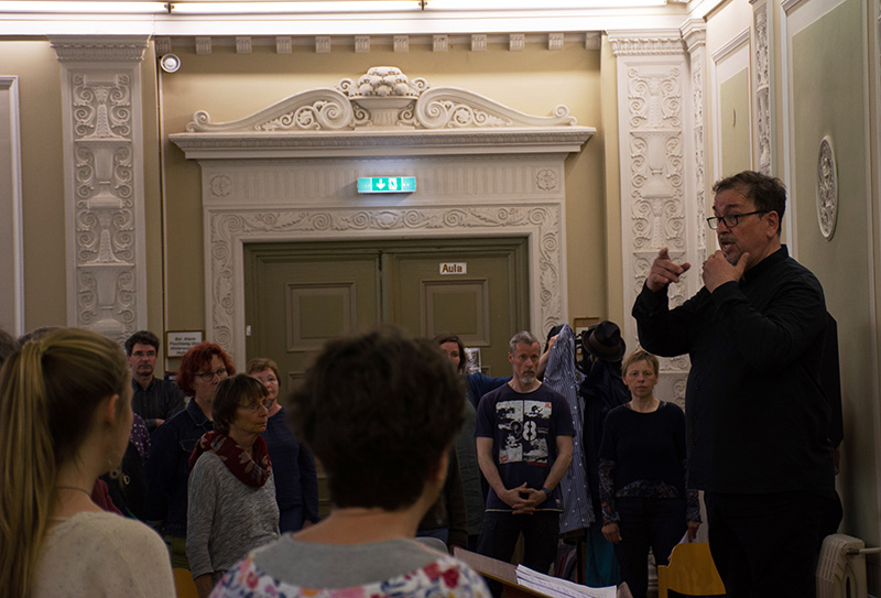 Die insgesamt über 100 TeilnehmerInnen gehörten etwa zur Hälfte der Singakademie an, andere kamen aus Fulda, Bonn, Köln und mehrere Mitglieder eines Kammerchores sogar aus dem Wendland! Der jüngste Teilnehmer war 15, die älteste Teilnehmerin 78 Jahre alt. Sie alle folgten den mit viel Humor, vor allem aber großer Detail- und Sachkenntnis vorgetragenen Anregungen mit Konzentration und setzten die Übungen interessiert und engagiert um. In einer unnachahmlichen Mischung aus unterhaltsam dargebotener Theorie und mit Intensität eingesetzter Praxis vermochte es Reiner Schuhenn hervorragend, das schwierige und für alle Chöre so grundsätzlich wichtige Thema darzustellen und Möglichkeiten der Erprobung zu schaffen, die am Nachmittag auch in das direkte Chorrepertoire mündeten (Schütz, Brahms, Beethoven). Für die Vertiefung im Eigenstudium konnten alle TeilnehmerInnen ein wundervoll strukturiertes „Handout“ mit den wichtigsten Leitlinien zum Thema mit nach Hause nehmen.